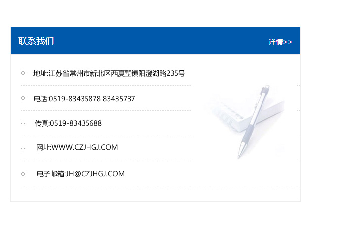 地址:常州市新北區友邦商務大廈1幢16、17層  電話:0519-85101652  傳真:0519-85112595  郵編:213022  網址:www.cz-jiayue_cn.tszhengxie.com  郵箱:xiajifengaa@163.com